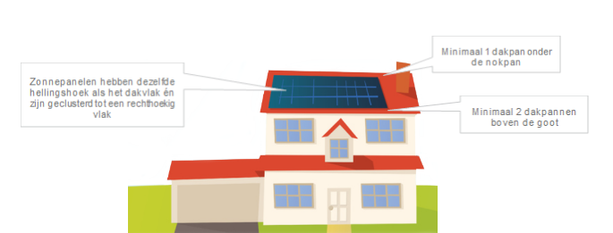 - zonnepanelen of -collectoren allemaal in dezelfde richting te plaatsen (staand of liggend) én samen te voegen tot één rechthoekig vlak of rechthoekige strook. Het patroon mag alleen onderbroken worden door dakdoorvoeren.