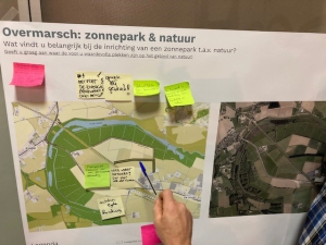 In deze eerste werksessie stond het ophalen van wensen en ideeën en het delen van gebiedskennis centraal. Net als het in beeld brengen van de kwaliteiten van en waarden in het gebied. Het doel van de avond was om een basis te leggen voor de invulling van de voorwaarden in het afwegingskader: wensen en ideeën ten aanzien van de inrichting van zonnevelden (inclusief meerwaarde voor de thema’s recreatie, landschap en beleving, natuur en biodiversiteit, landbouw), participatie (tijdens het planproces) en financiële participatie.