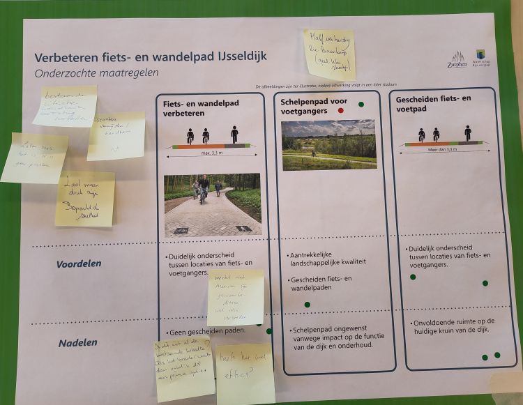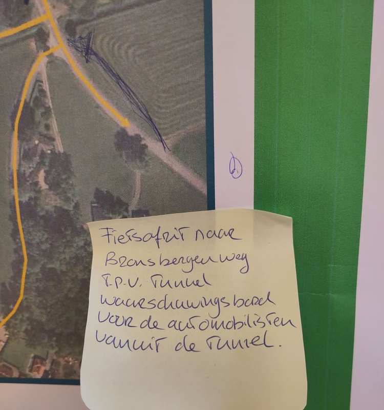 Bij de bijeenkomst konden de aanwezigen hun reactie geven op de informatie. Soms door dit op een geeltje te schrijven, soms door rode of groene stickers te plakken. Deze reacties hebben we meegenomen in de verdere uitwerking. Maar ze waren niet bedoeld om ‘te stemmen’. Dus meer rood dan groen betekende niet: we gaan het niet doen.