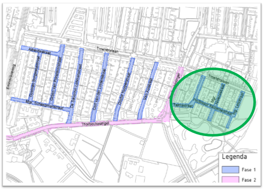 De werkzaamheden voor het vervangen van de riolering worden in verschillende fases uitgevoerd en duren in z'n geheel tot eind dit jaar. We beginnen aan de rechterkant van de Thorbeckesingel met de rioolwerkzaamheden, zoals hieronder met een cirkel in de afbeelding aangegeven.