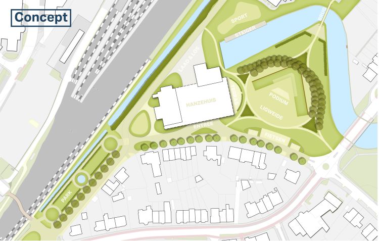 Voor de openbare ruimte rondom het Hanzehuis is een CONCEPT schetsontwerp/structuurbeeld gemaakt. Dit is een tekening waarin de hoofdstructuur van het ontwerp is aangegeven. De precieze invulling volgt nog. Denk aan het type bestrating en de invulling van de groenvlakken met beplanting en (bestaande) bomen.
