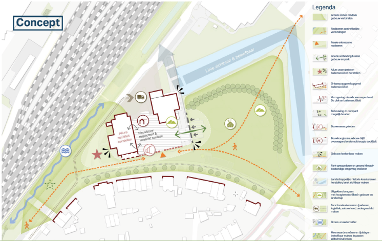 Ander leidend thema is de inpassing binnen het beschermd stadsgezicht, de verbinding met de historie en de parkachtige omgeving.