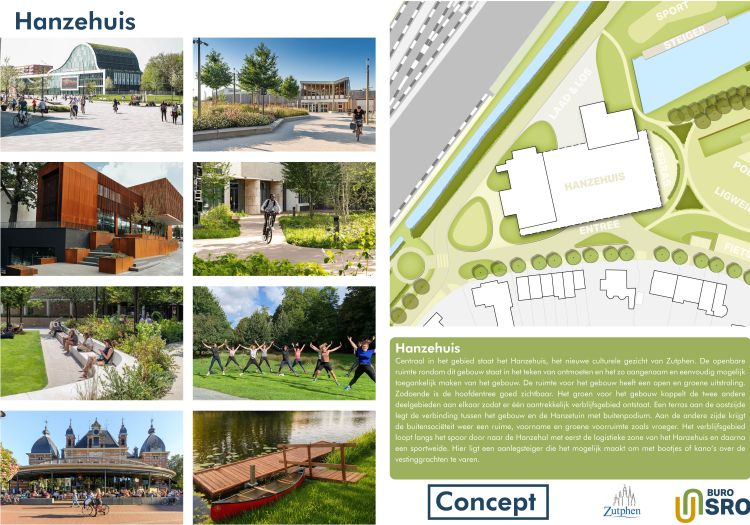 Centraal in het gebied staat het Hanzehuis, het nieuwe culturele gezicht van Zutphen. De openbare ruimte rondom dit gebouw staat in het teken van ontmoeten en het zo aangenaam en eenvoudig mogelijk toegankelijk maken van het gebouw.