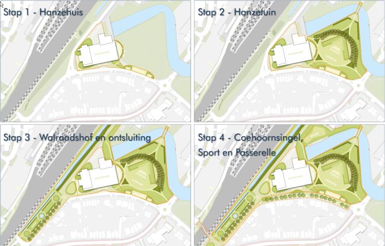 Het schetsontwerp is een toekomstbeeld. Het aanpassen van het buitengebied gaan we in stappen doen. De bestaande situatie blijft eerst nog voor een deel zoals die is nadat het Hanzehuis gerealiseerd is. De aanpassingen doen we uiteraard wel zo snel mogelijk.