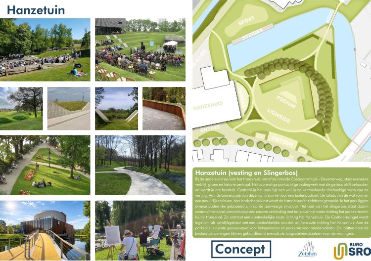Ook bij deelgebied Hanzetuin staan verblijf, groen en historie centraal. Dit is het gebied rondom de andere entree naar het Hanzehuis, vanaf de rotonde Coehoornsingel - Deventerweg.