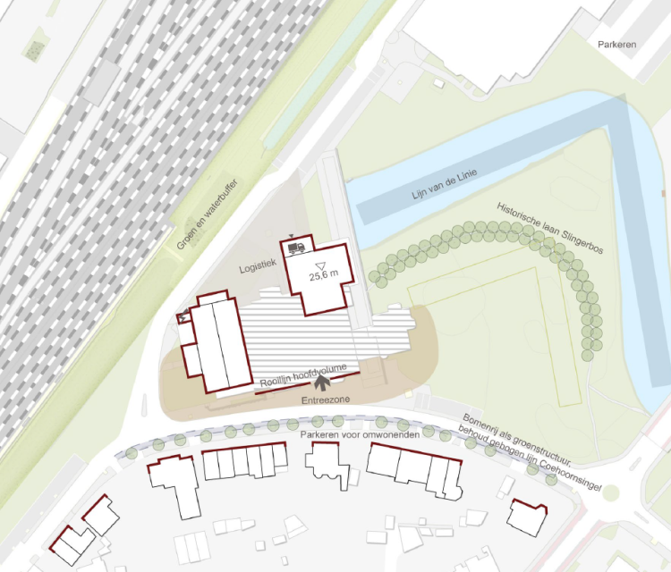 - Geen massief blok: grote gebouwonderdelen worden ‘ingebouwd’ of geleed voor een kleinschalige, paviljoen-achtige uitstraling.