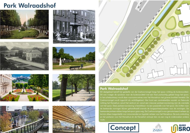 Vroeger was dit de oprijlaan naar de buitensociëteit met een fraai parkachtig gebied langs het spoor. In het schetsontwerp wordt deze voorname entree naar het Hanzehuis met groene kwaliteit hersteld.