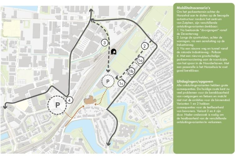 Op onderstaande afbeelding ziet u de mobiliteitsscenario's. Uitleg: om het parkeerterrein achter de Hanzehal aan te sluiten op de beoogde autostructuur rondom het centrum, gaat het verkeer van en naar het parkeerterrein achter de Hanzehal: